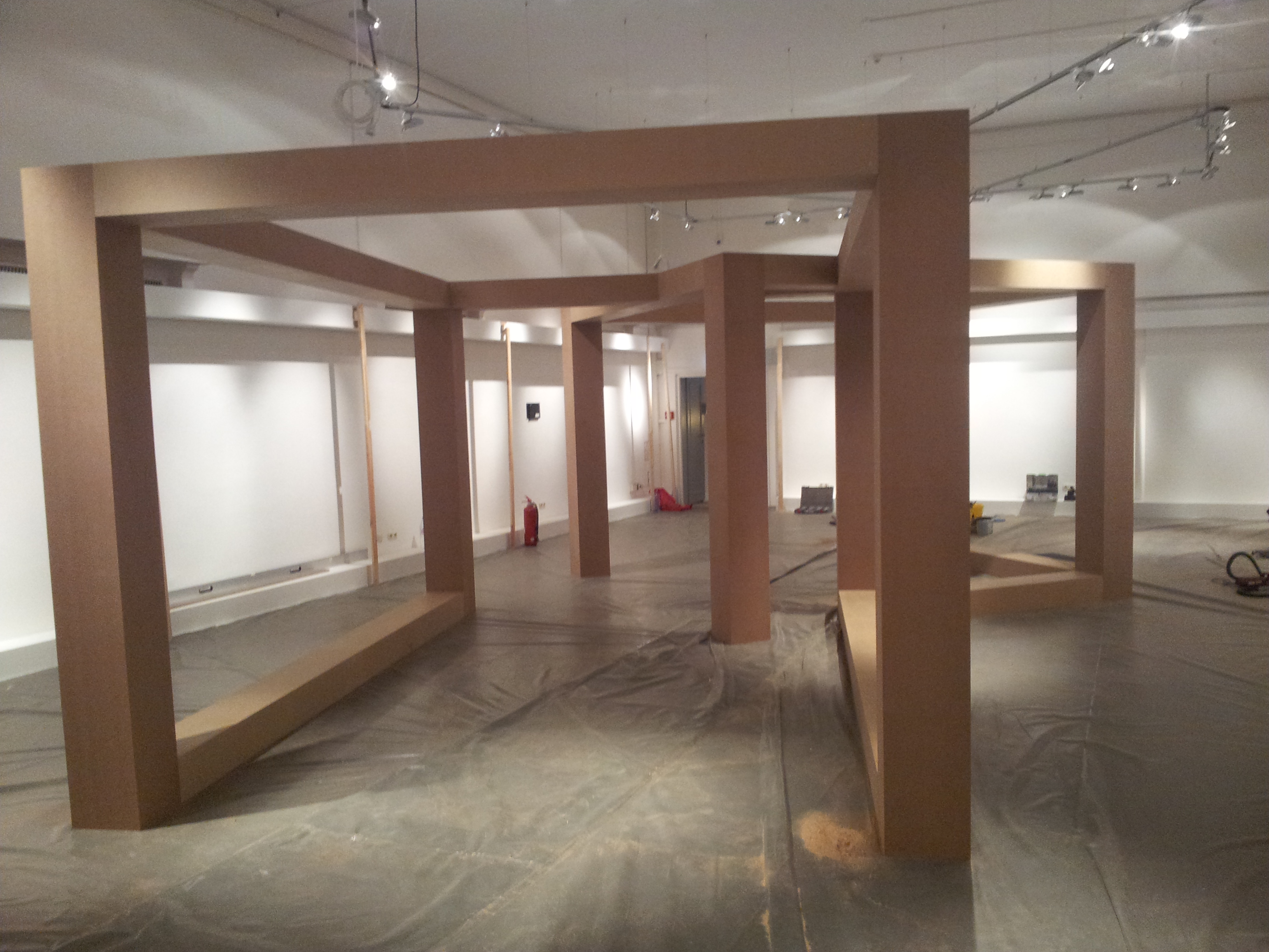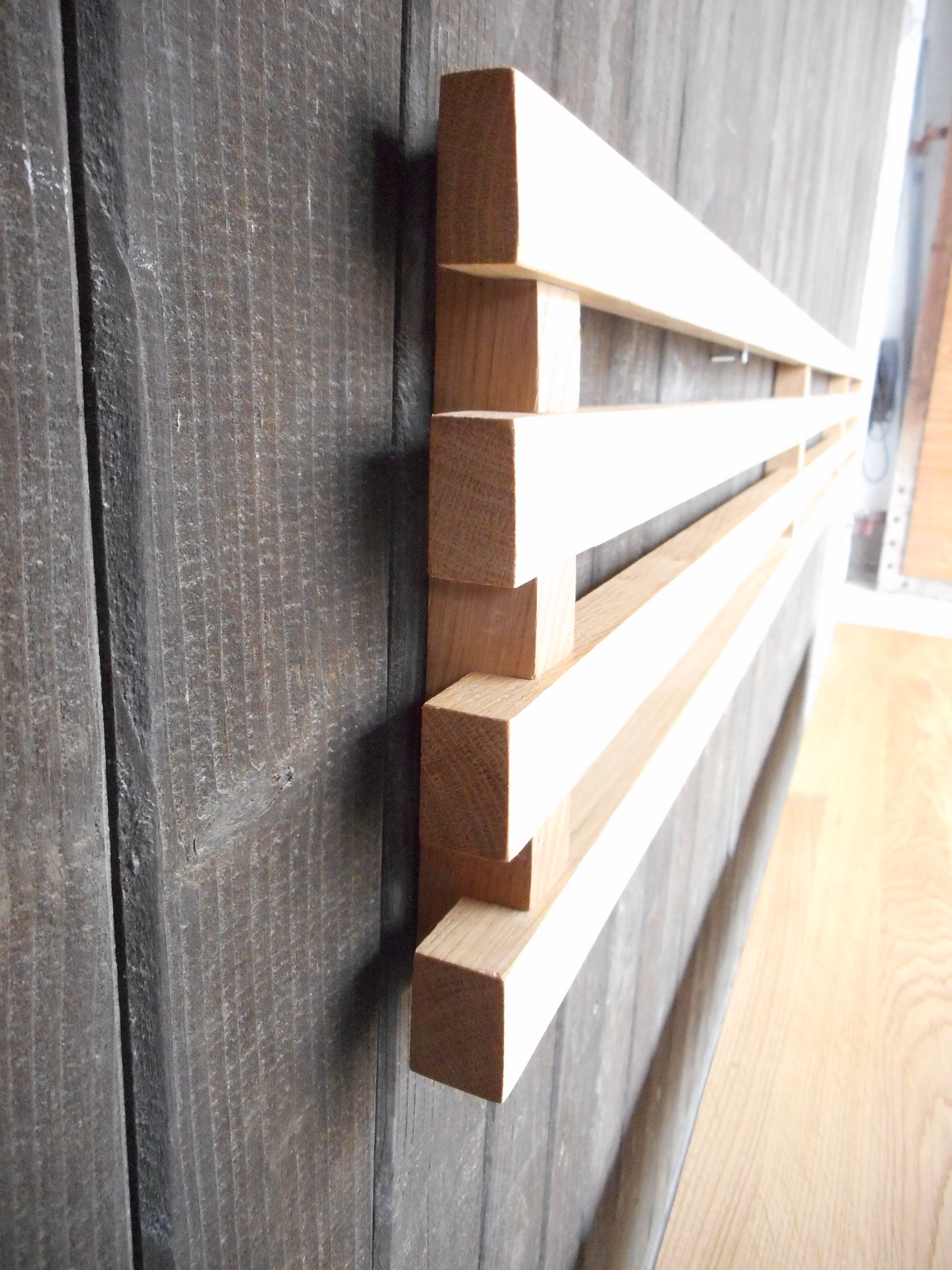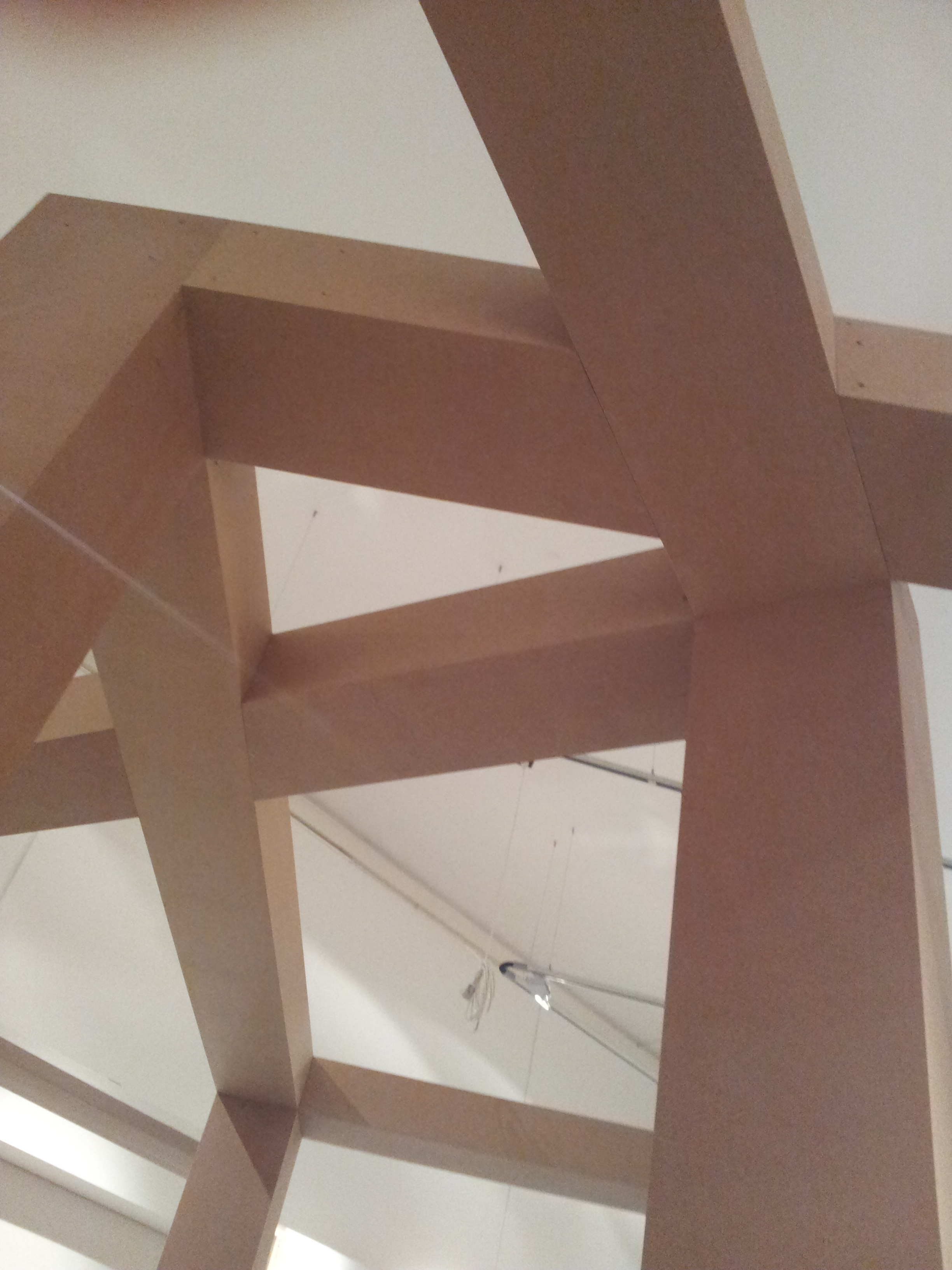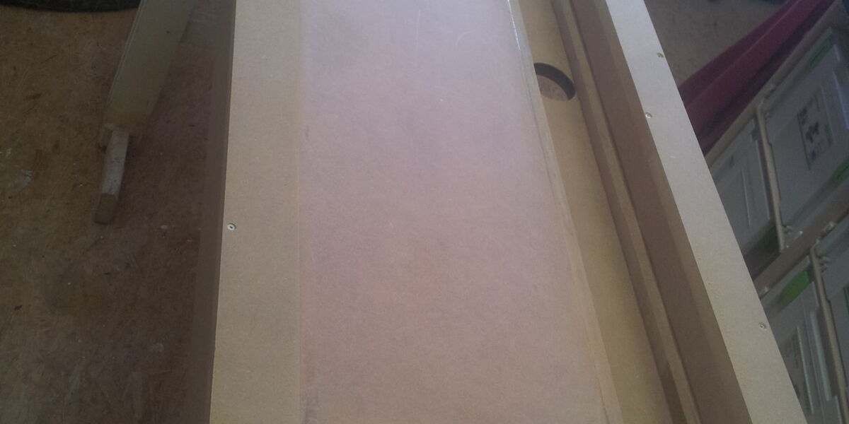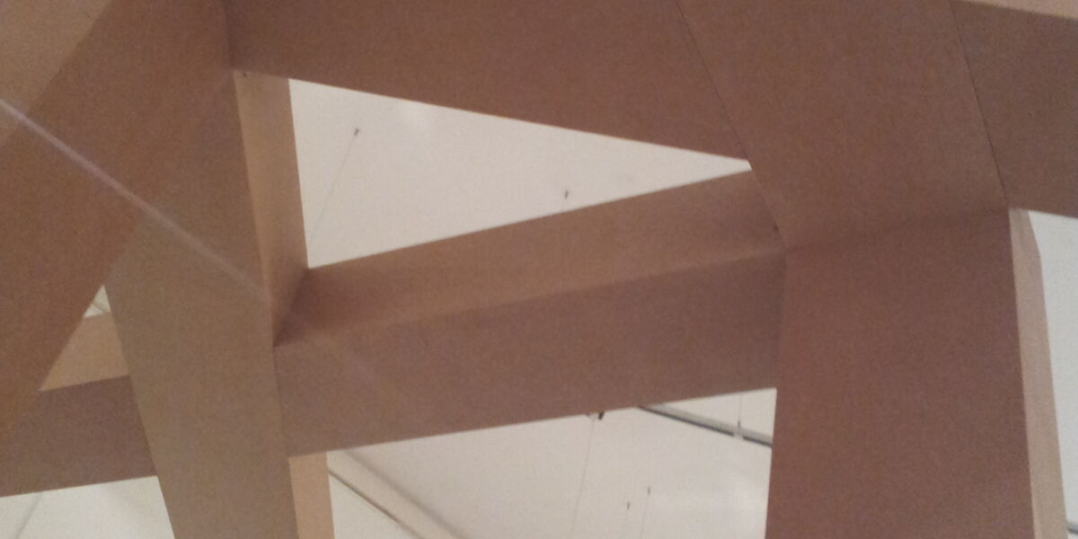 Für die Helix werden 24 bzw. 34 Holzrahmen gefertigt. Diese werden gebohrt und anschließend geschliffen. Nach der Oberflächenbehandlung werden die Rahmen mit den gewünschten Abstandhaltern in die gewundene Form gebracht.